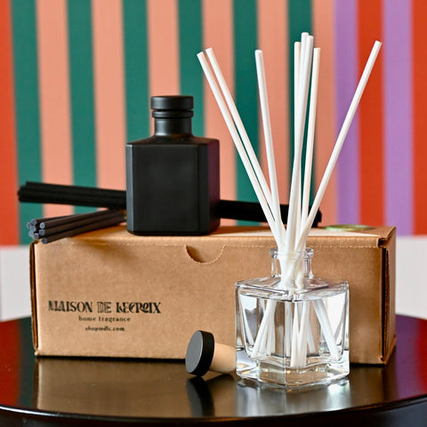 Available in your choice of a clear beveled glass vessel with white fiber reeds or a matte black vessel with black fiber reeds. Enjoy months of your favorite MDLC fragrances, delivered in lasting, flameless wafts perfect for any space—entryways, home offices, bathrooms, walk-in closets, or window sills. Flip the reeds weekly for fresh bursts of fragrance that linger beautifully.